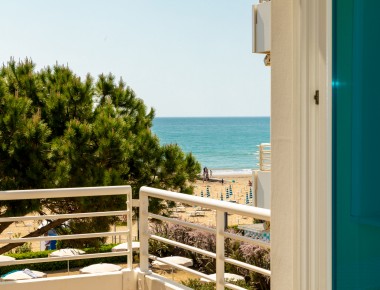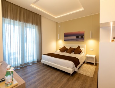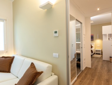 A charming, bright and colourful large-sized room that is ideal for couple and large families: a modern and dynamic accommodation choice. There are two separate communicating rooms: on the one side, there's the double bedroom and on the other, a bedroom-living area with a comfortable sofa bed. There is also a large bathroom with a spacious shower. The entire room can host up to 4 people, making it the ideal solution for those couple and families wanting to spend their holiday together without giving up their own comforts and privacy.
