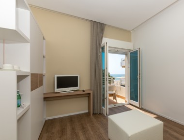 suite 38sqm, balcony with table and chairs, with side sea view, desk, 2x 40'' flat screen TVs, mini bar, waterboiler, digital safe, wifi, air conditioning, bathroom with shower, bathrobe, hairdryer