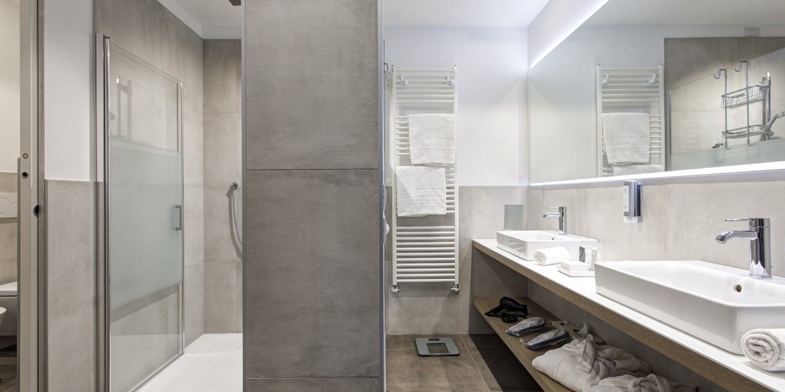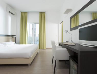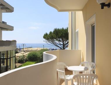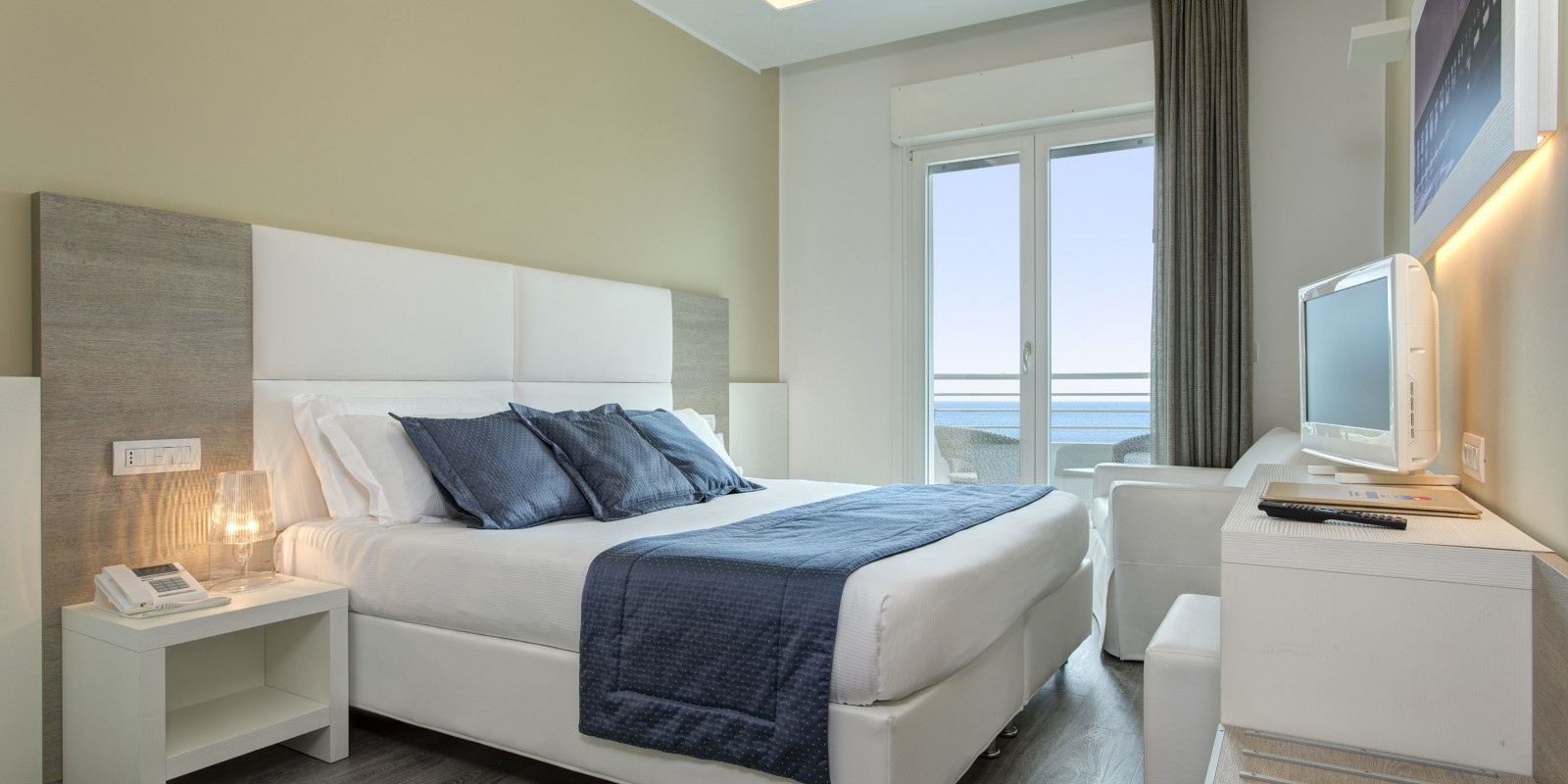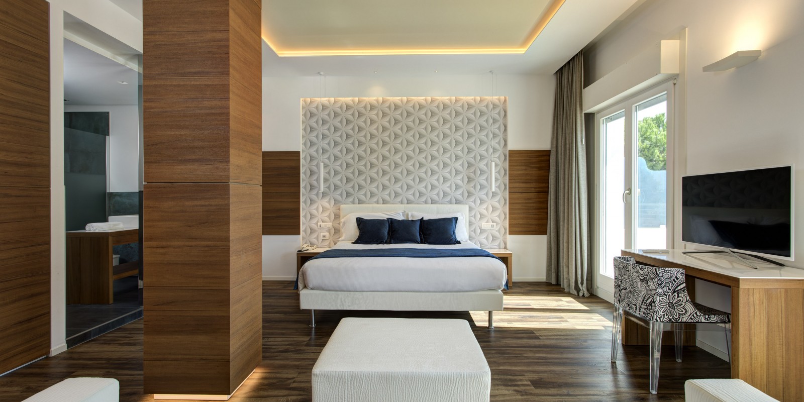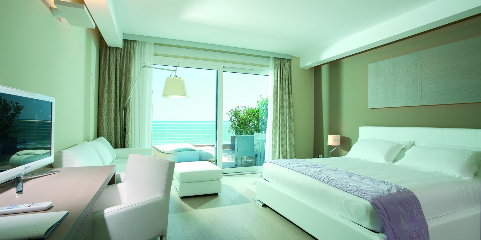 Camera 32 mq con due locali separati, balcone con tavolo e sedie, con vista mare laterale, scrittoio, 2 Tv 43'' a schermo piatto, minibar, bollitore, cassaforte digitale, wifi, aria condizionata, bagno con doccia, accappatoio, phon