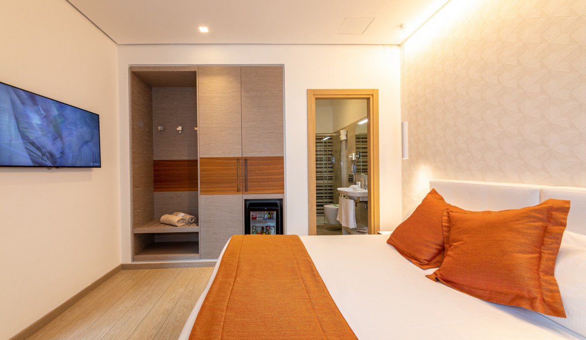 double room 20sqm, balcony with table and chairs, with view over the square Aurora, desk, 43'' flat screen TV, mini bar, waterboiler, digital safe, wifi, air conditioning, bathroom with shower, hairdryer